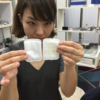 左のコットンが使用前。右が使用後。汚れが落ちているのがよく分かりますねー。