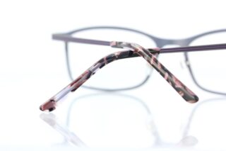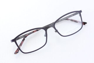 艶を抑えたグレーのメタルフレーム、ランズをぐるっと囲み智元からテンプルに繋がるパープルのダブルラインが程よいアクセントに。