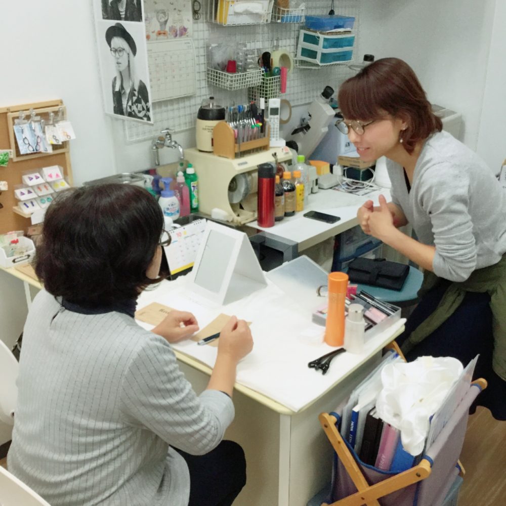 当店では「似合うメガネ選びのお手伝い・提案」と共に「メガネに合うメイク」で、更にメガネを楽しく自信を持ってかけて頂けるようサポートしています。