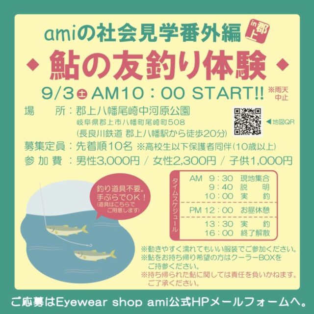 今年はamiの社会見学番外編として9/3(土)に郡上八幡で鮎の友釣り体験を行います。