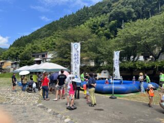 鮎EXPOでは鮎のつかみ取りやウォーターガンファイト、また様々な飲食店や物販が行われました。