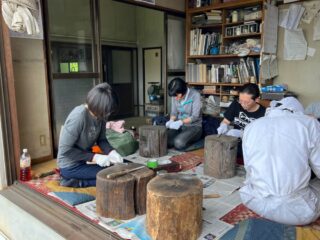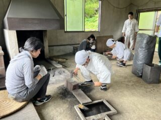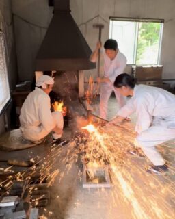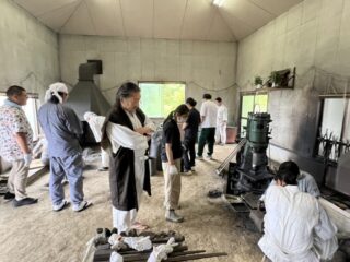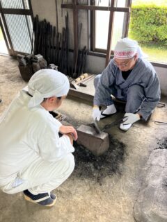 途中、お弟子さんに日本刀作りの工程を教えていただいたり、古式日本刀鍛錬を見せていただきました。