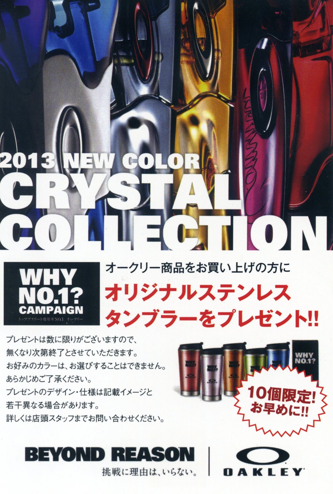 OAKLEYいつ買うの? 今でしょ! イベント 投稿日| 2013.06.23 最終更新日| 2013.09.05 今日も良い天気~~ こんな日はサングラス、マストアイテムですよ 今年あたり、OAKLEYのサングラス欲しいな~って思っていたり、もう一本欲しいって 思ってたんだよな~ ていう方には朗報 「OAKLEY WHY NO.1 CAMPAIGN」実施中です。 先着で、OAKLEYオリジナルタンブラープレゼント。 数量限定ですので、お早めに