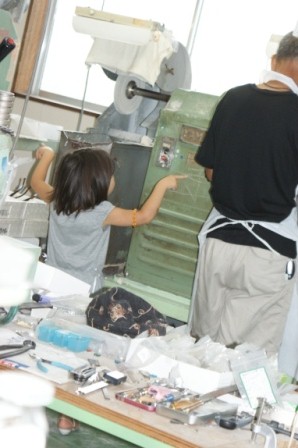 娘たちはすっかり飽きてしまい……切れ端で作っていただいたハート型やミッキー型のセル生地を職人さんに泥バフかけしてもらい、艶々にしてもらったりと、工場内をうろちょろ。