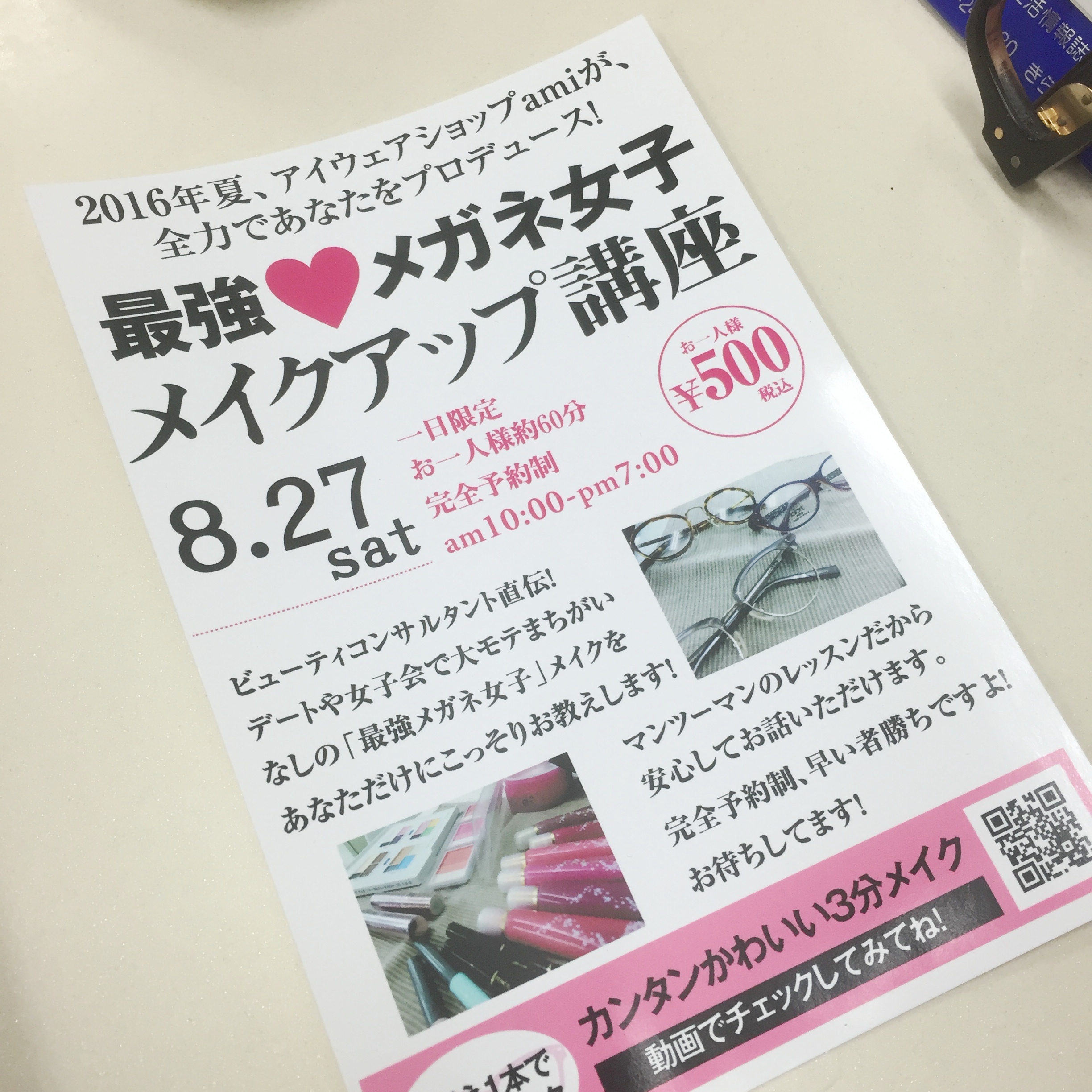 第2回 最強❤メガネ女子 メイクアップ講座 イベント 投稿日| 2016.08.21 最終更新日| 今日はイベントのご案内です。 先月開催した、 「最強❤メガネ女子 メイクアップ講座」大好評につき、第2回が開催されます。 8月27日 土曜日 AM10:00~PM7:00 おひとり約60分 500円 完全予約制です。 眼鏡に似合うメイクの方法を中心に、ビューティーコンサルタントの先生にマンツーマンで指導していただけます。 マンツーマンということで、その人のお悩みにもビシッと答えてくれますよ。 完全予約制ですので、ご希望の方は、メール、TEL、直接店頭にてご予約ください。