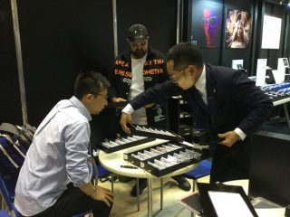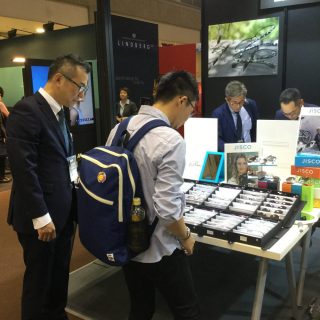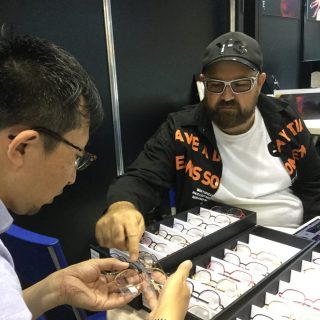 しっかり仕入れもします。PARASITE・noeGoのデザイナー、ヒューゴ・マーティンさんの説明を聞きながらどれを仕入れようか真剣に吟味します。