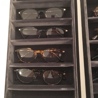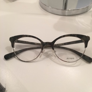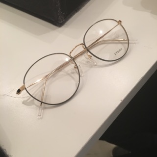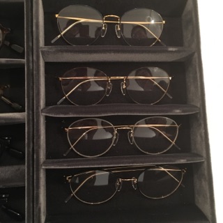 細リムのメガネ。今流行りのメガネですね。ブルーやデミ柄は他でもよく見ていたのですが、こちらはグレー。