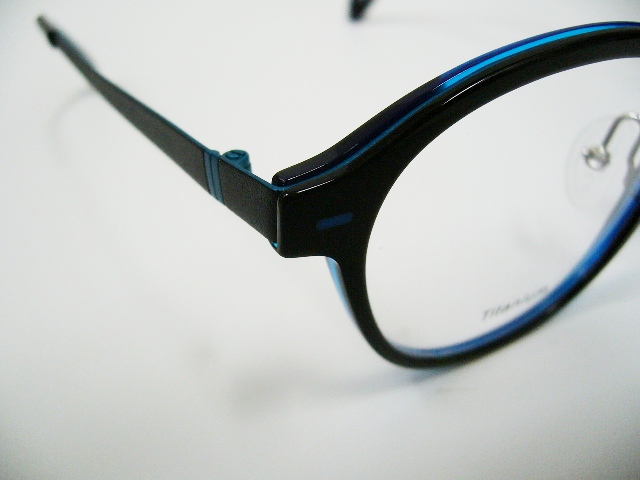 フロントのアセテート樹脂に挟まれたメタル素材のブルーラインがポップで陽気な雰囲気を感じさせます。