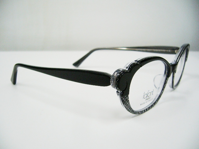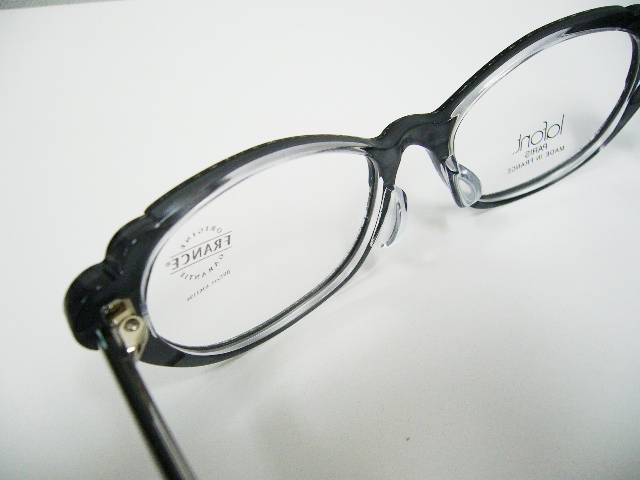 このメガネ、下半分はグレーベースの大理石のような柄になっており、さらにシルバーで網目状のテキスタイル生地が挟まれているんです!華やかですねー。