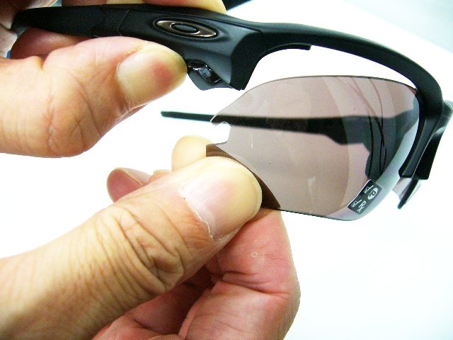 前回ご紹介したモデルと同様に、アイコンの下に付属している黒いボタンを押しこみ耳側のレンズを下に引けば簡単にレンズの取り外しが出来ます。