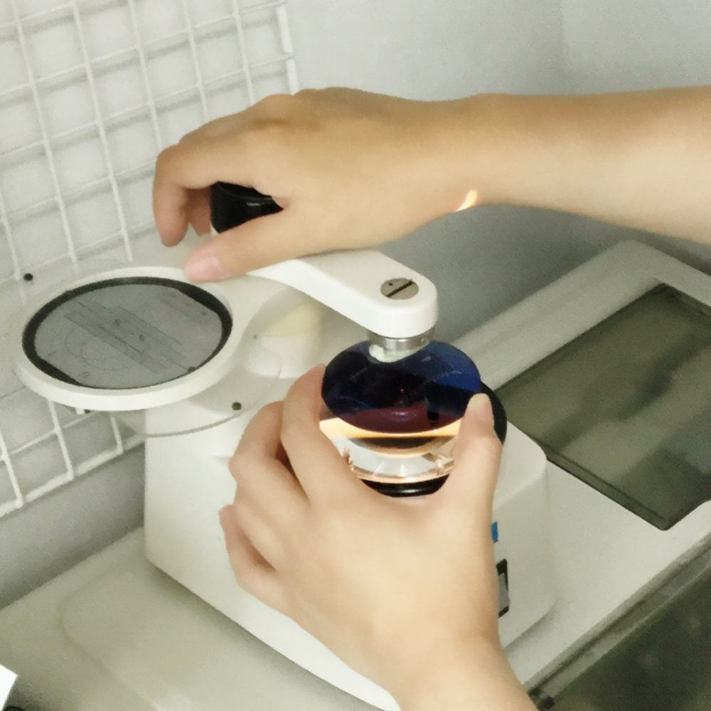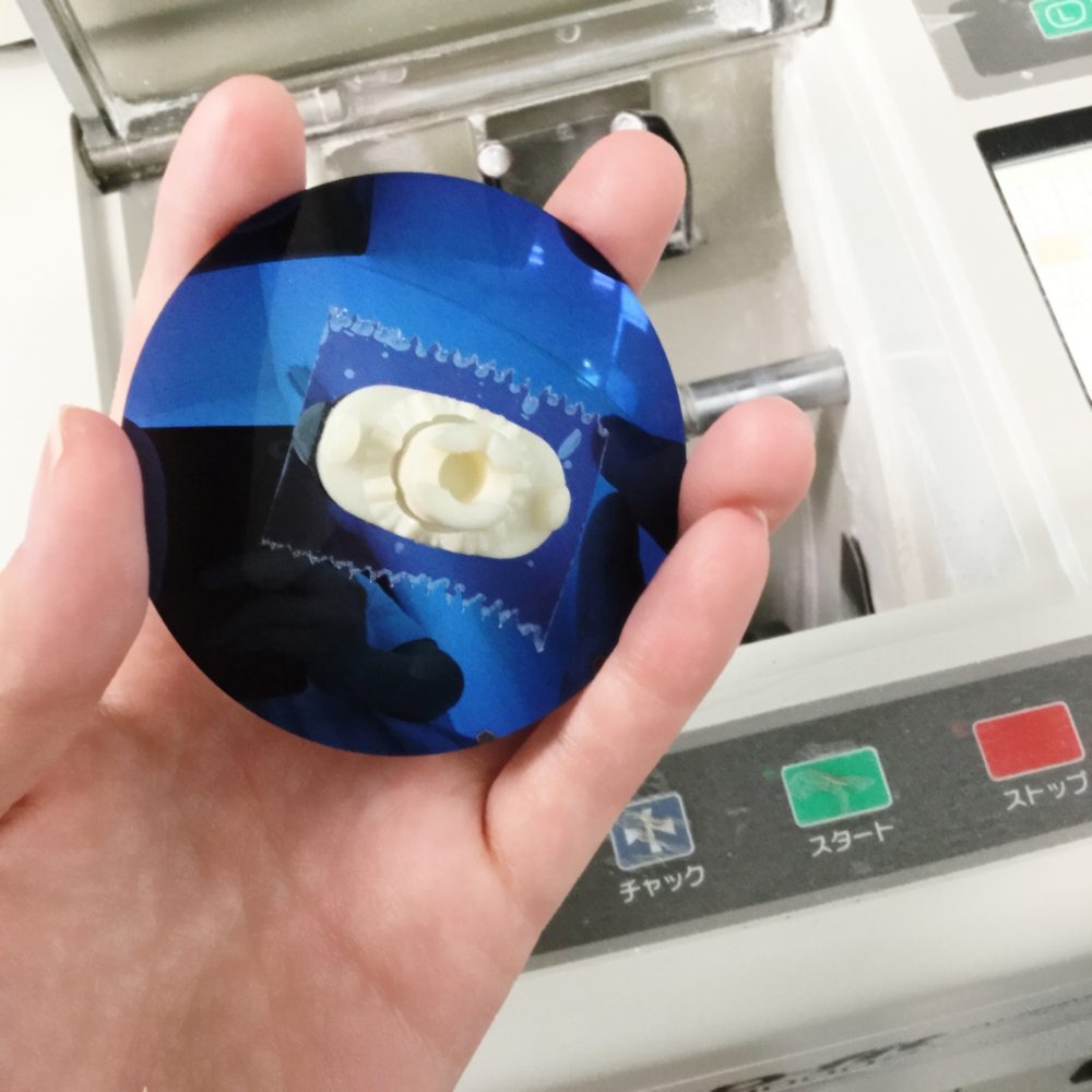 機械にセットして砥石で削ります。ガッツリ削られていくレンズを見るのは結構楽しい。(^o^)