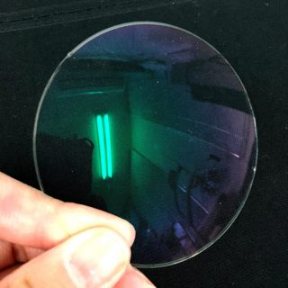 レンズの表面にはUVカットなどのコーティングが施され蛍光灯の光が緑っぽく反射してますね。