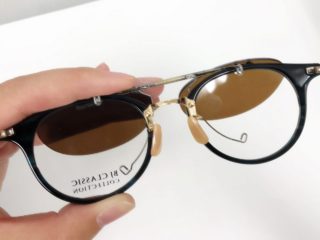 まずメガネフレームにフリップアップパーツの上部フックを引っかけます。