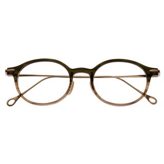 col.116 オリーブグリーン×クリアブラウンのツートンカラー。落ち着いたカラーでちょっと渋さも感じられます。ゴールドのテンプルがいいアクセントになっていますよ。