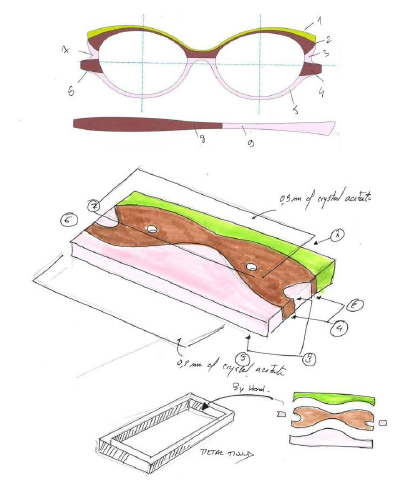 図のように、複数の生地を組み合わせ四角いトレーに入れて圧着し、その後レンズの形にくり抜いているんです。まるでパズルの様ですね。