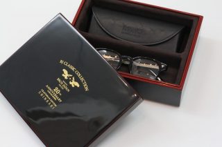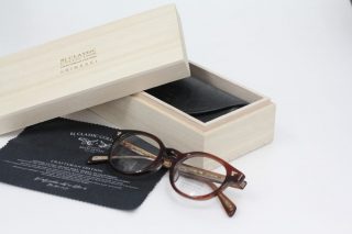 また外装にはロゴが刻印された桐箱も。メガネクロスも特別仕様のデザインです。