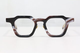 レンズの形は変形六角形、男性的な印象のあるフレームです。