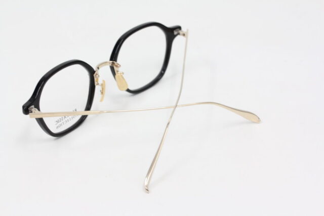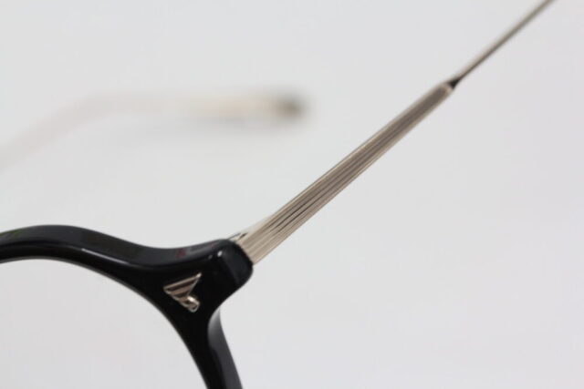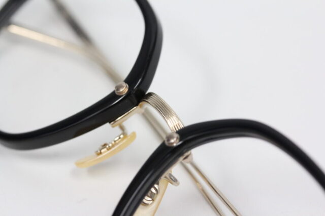 レンズ周りはやや細めなプラスチック枠、そして視線を集めやすいブリッジをメタルパーツにすることで全体的にスッキリとした印象に。