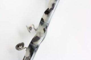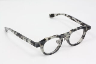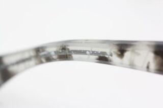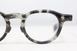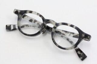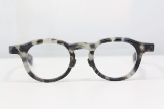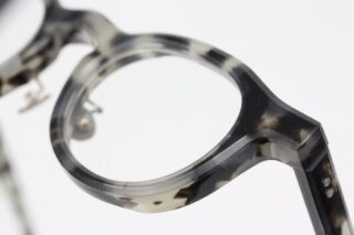青みのあるグレー生地をベースにデミ柄(べっ甲柄)が入った希少なセルロイド素材のボストンフレーム。