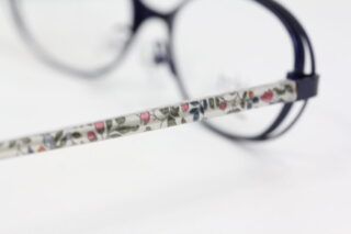 テンプル部分を触ってもらうとザラっとした手触りを感じるのですが、これはプラスチックの間に本物のテキスタイルが挟まれているから。