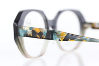 ラウンド寄り丸みの強いレンズシェイプ、フレームは対照的に直線を多用したフレームです。