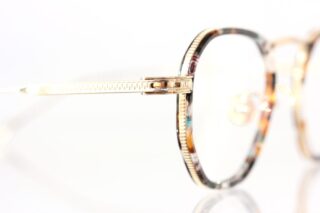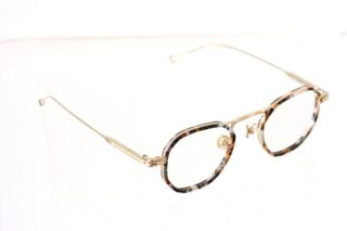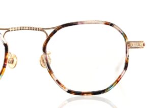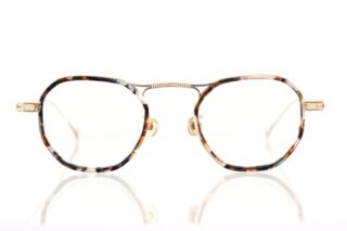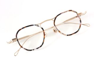 ハイブリッジな多角形フレーム。レンズを入れるリム部分にプラスチックの輪っかをはめたデザインです。