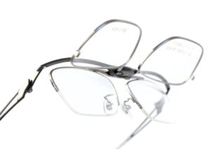 メカニカルな印象も感じられる複式跳ね上げメガネ。