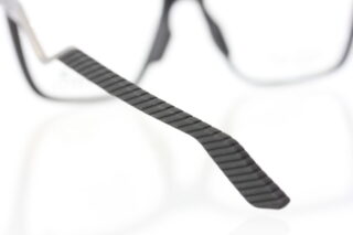 フロント分部、艶を抑えたマットブラックとは対照的な光沢のあるメタリックグレーのテンプル。