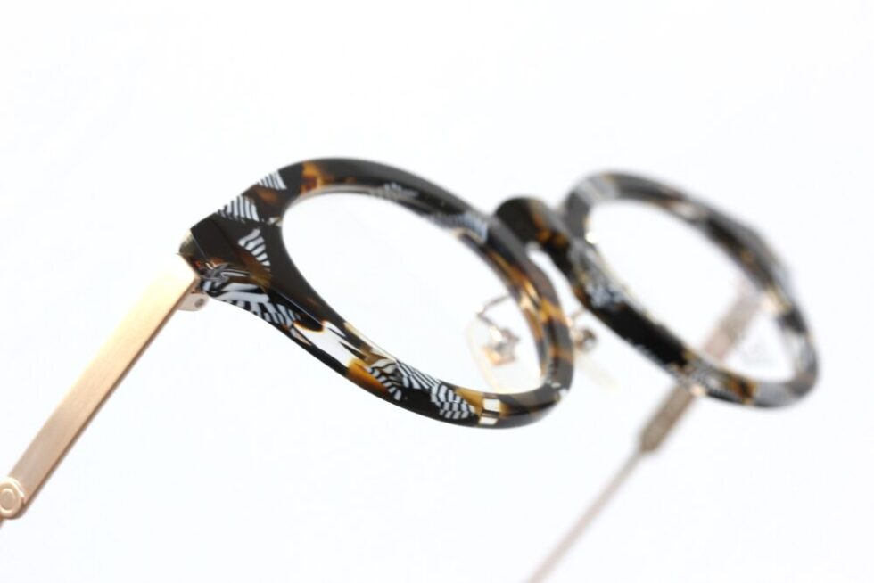 ベースとなるべっ甲柄に白と黒の幾何学的なラインが組み合わされ、まるで絵筆で描いたようなリズムが感じられます。