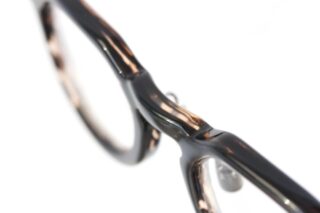 正面から見ると黒く見えます。しかい角度を変えると黒に近い深いブラウンの中に透ける色合いが、厚リムという重厚さの中でも柔らかさを演出します。