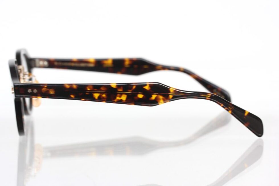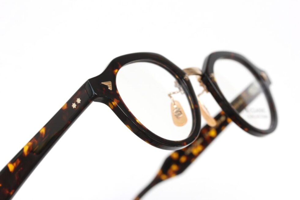 ブリッジには彫金入りのメタルパーツを採用。温もりのあるゴールドカラーが上質なアクセントとして映え、フレーム全体に知的な印象を添えています。