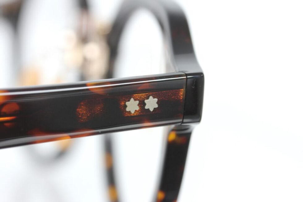 テンプルサイドには六芒星のカシメピンを採用。