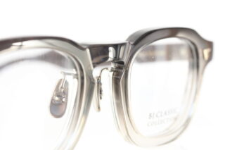 厚リムタイプのフロントは、上部に向かってグレーが深まり下に行くほどクリアに抜けていく色調は、肌になじみつつも表情を引き締めてくれる絶妙カラー。