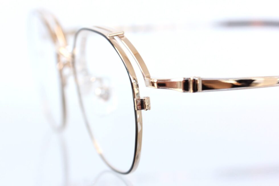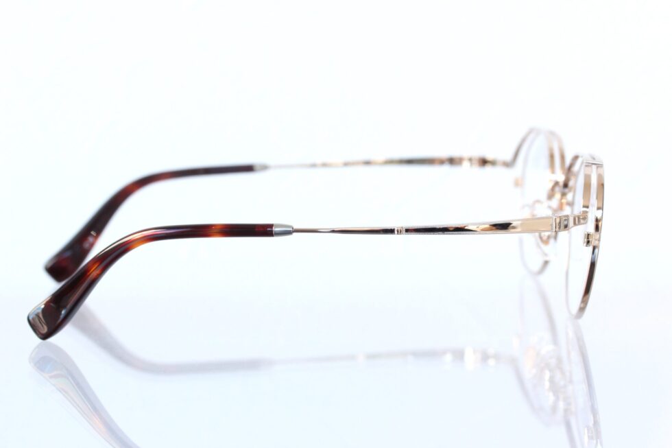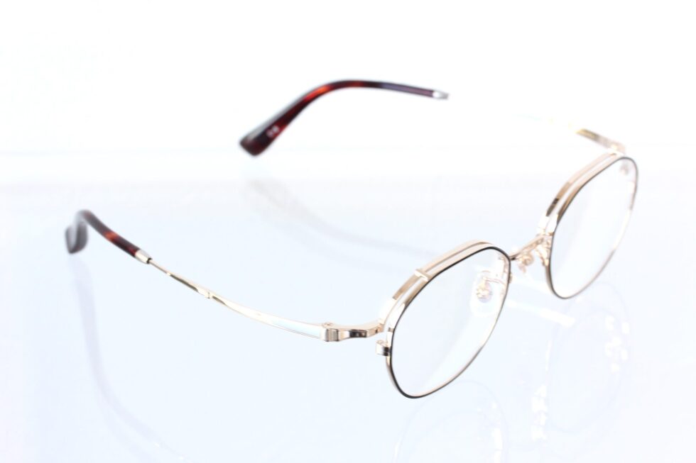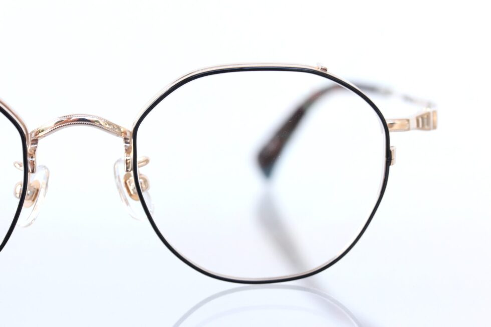 正面は細身のリムにブラックを効かせ輪郭をすっきりと引き締めつつ、上品なゴールドの輝きが全体をまとめています。