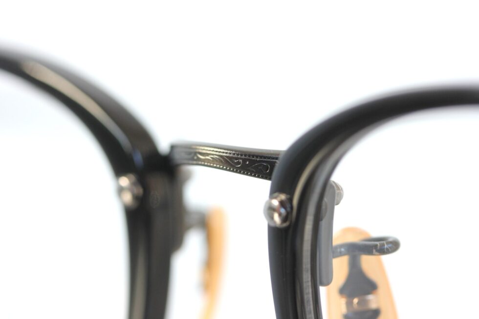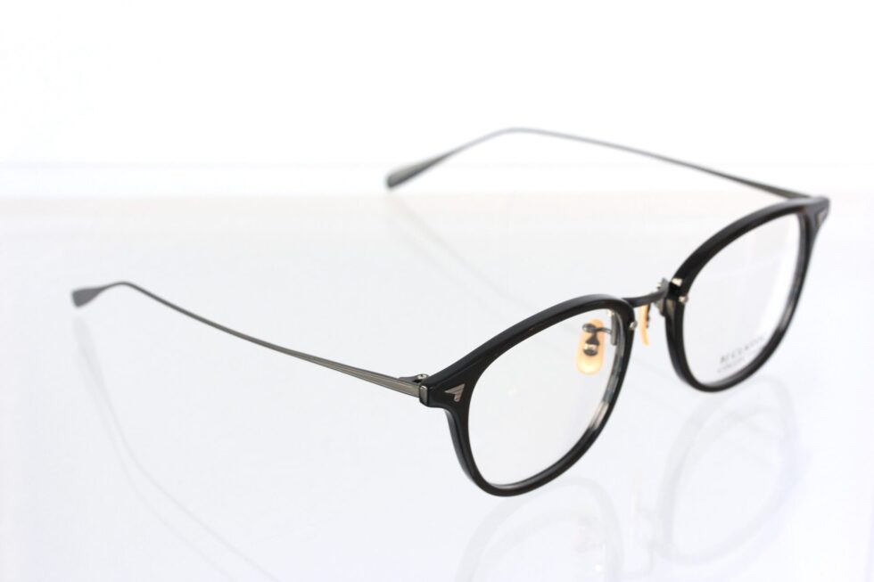 金属ブリッジと極細テンプルの落ち着いたマットブラックカラーは、フロントの暖色とのコントラストが美しく、上品さと軽快さを同時にプラス。