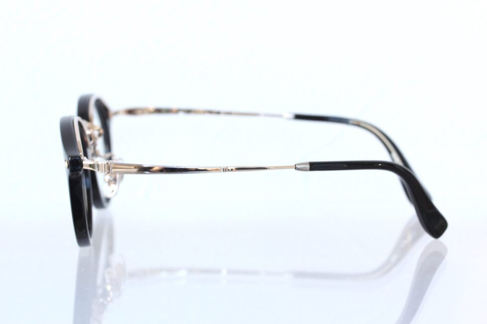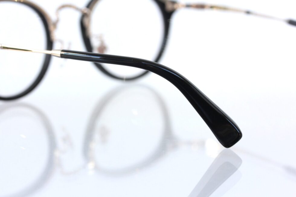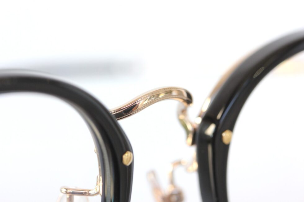 ブリッジとテンプルには繊細な彫金を施したメタルパーツを採用し、プラスチック生地との素材対比が美しく際立ちます。