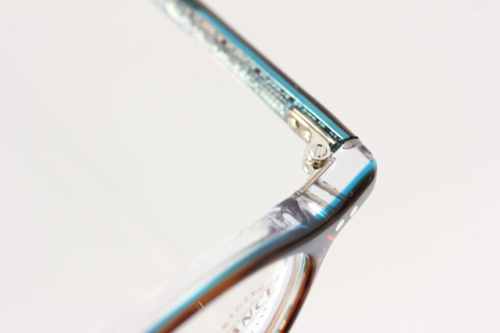 一方でテンプル内側には鮮やかなブルーを差し込み、横顔にさりげない遊び心をプラス。