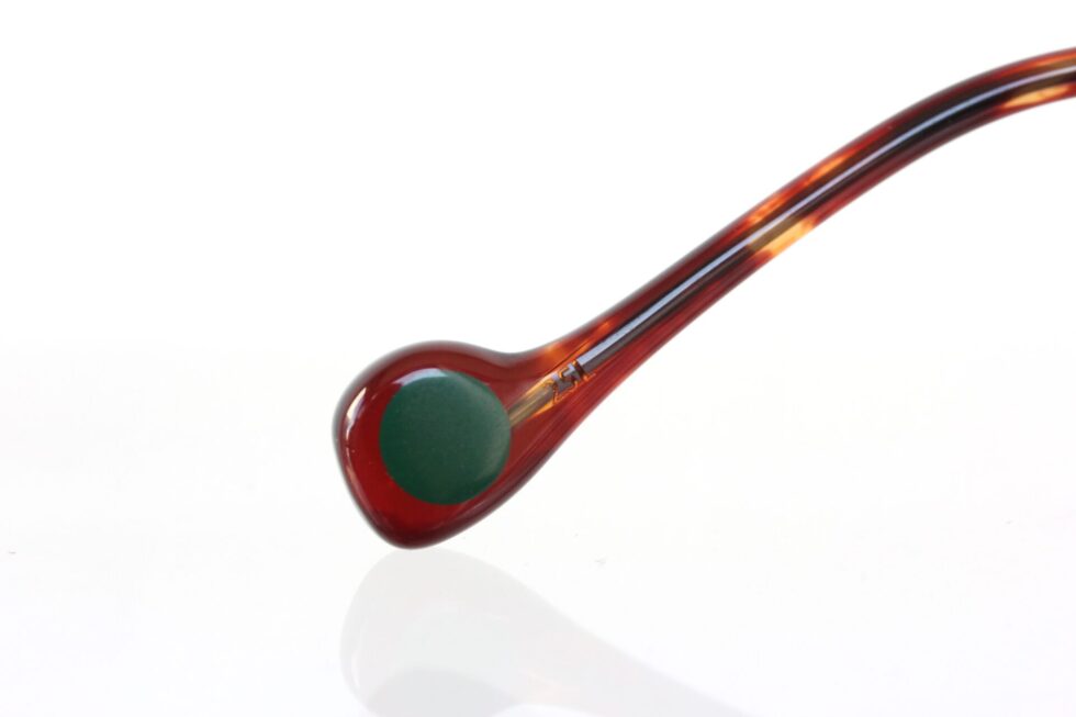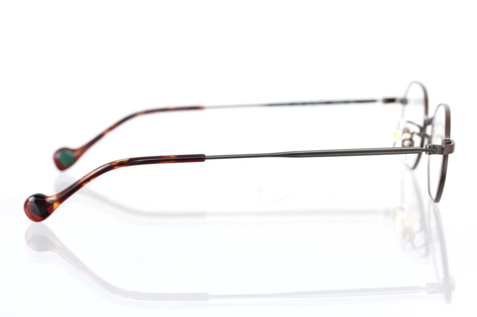 フロントは細身のメタルで構成されており、アンティーク調のブラウンをベースにしつつ、ブロウ部分にはアクセントカラーとなるグリーンがそっと添えられています。