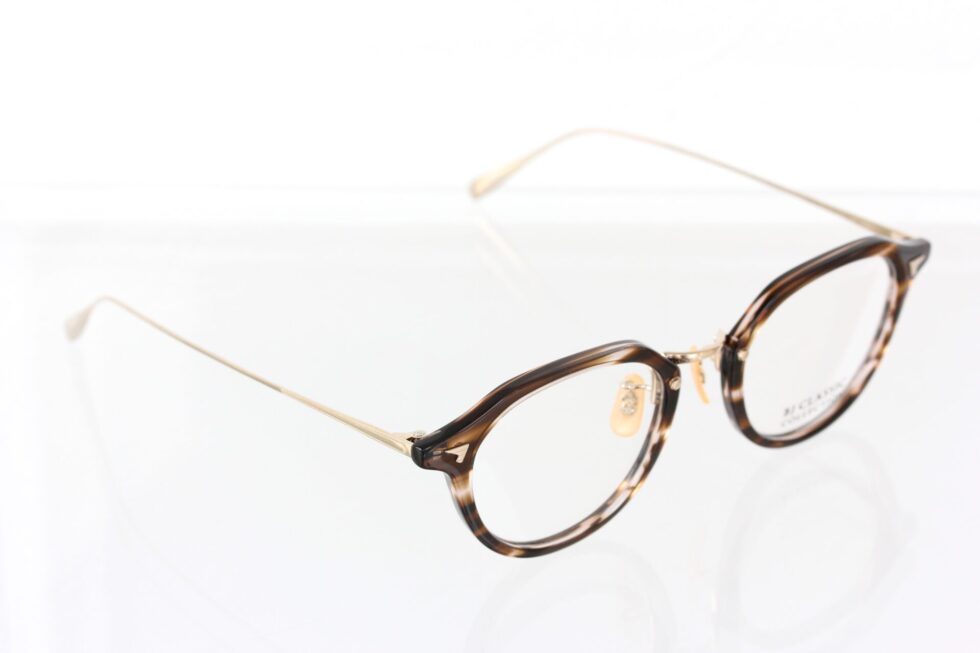 プラスチックフレーム特有のやわらかさに、金属の質感が加わることで、優しい雰囲気のなかに芯のある表情が加わります。