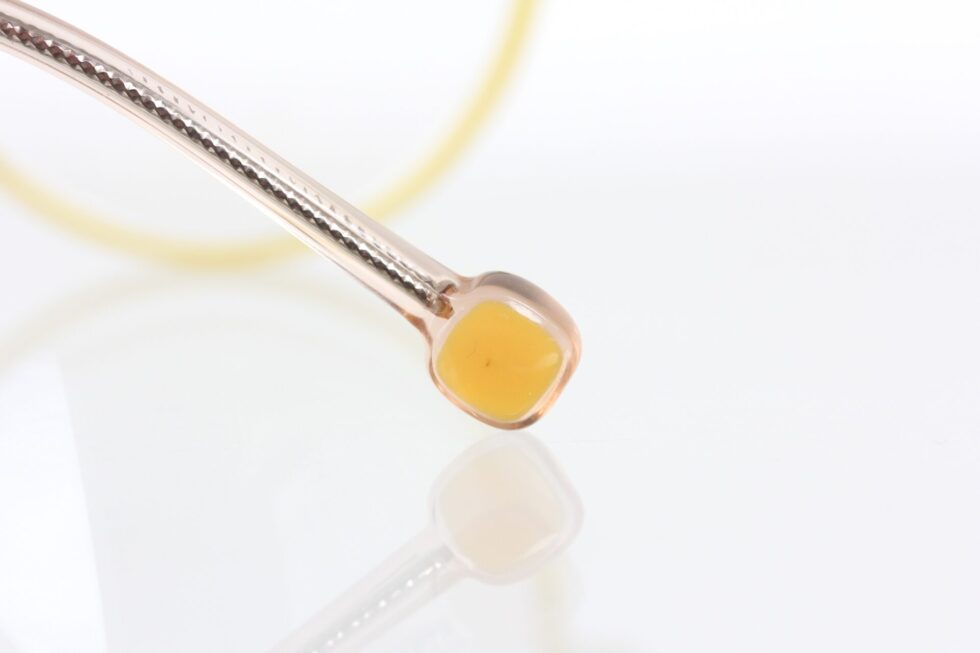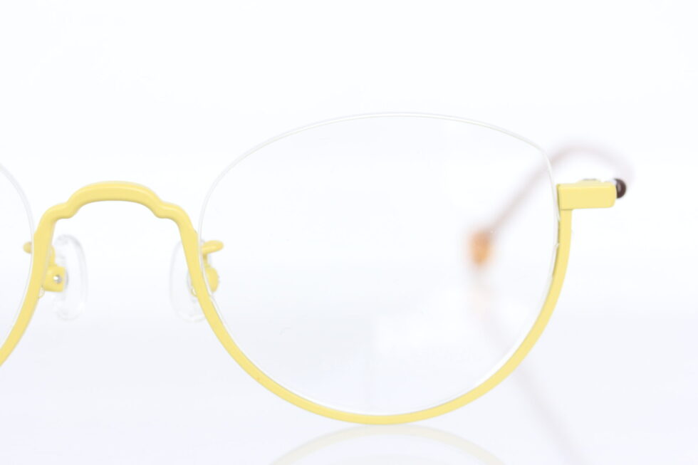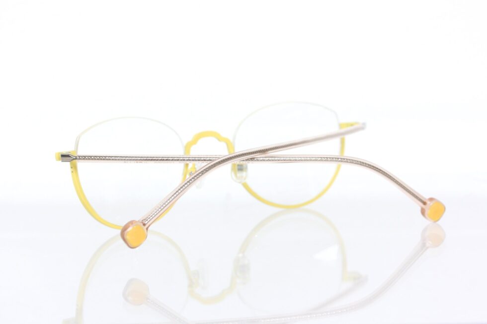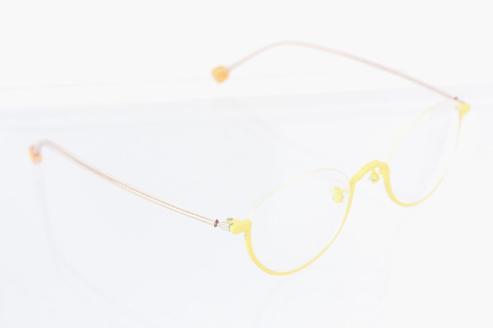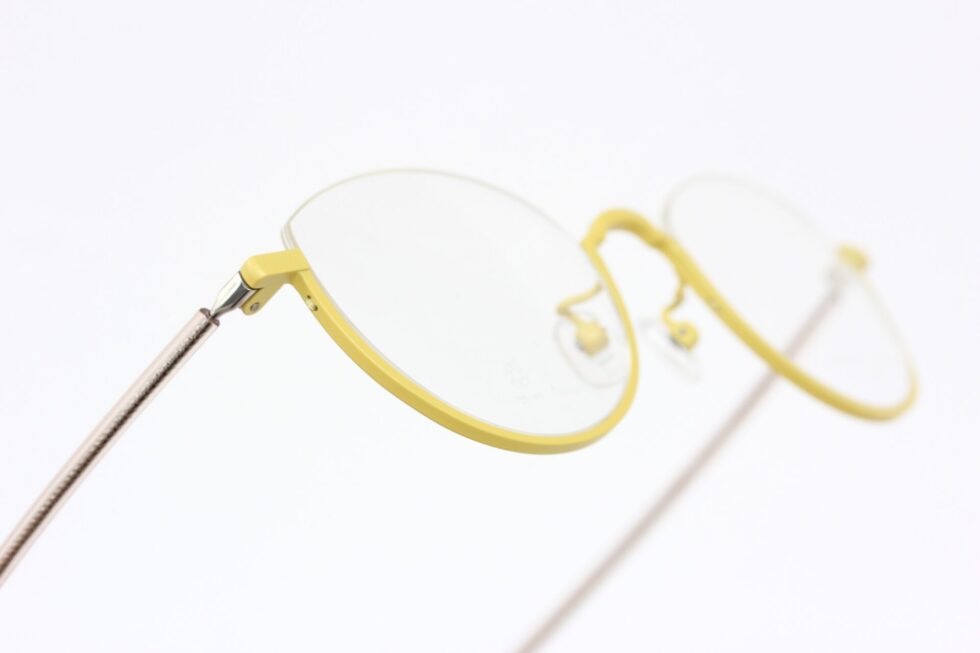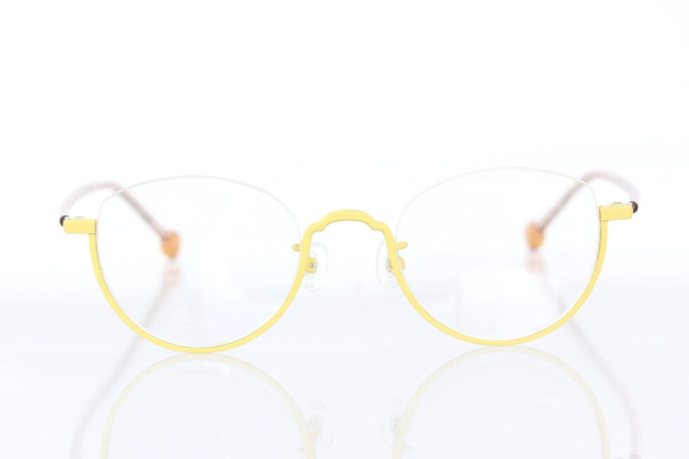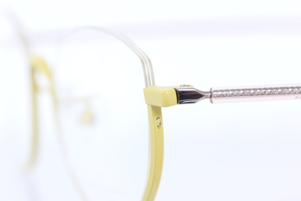 ワイヤーの様なバネ性のあるテンプルをクリアカラーのプラスチックで包み、先セルにあしらわれたイエローはフロントカラーと合わせた組み合わせ。