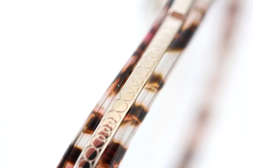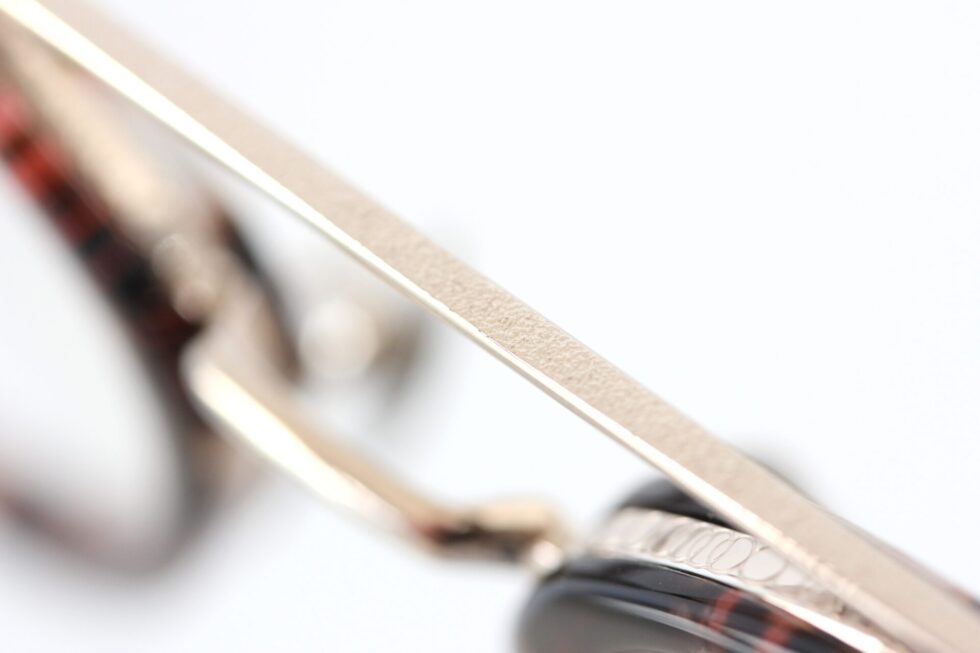 メタルリム部分にはランダムに連なる円模様の彫金柄が入り、角度によって繊細な陰影が浮かびます。