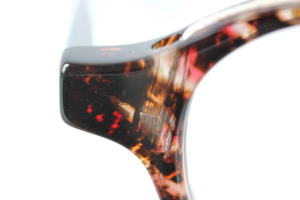 このフレームの最大の特徴は、プラスチックのリム枠へ穴を開け、そこへメタルリムを通してネジ留めする特殊な作り。