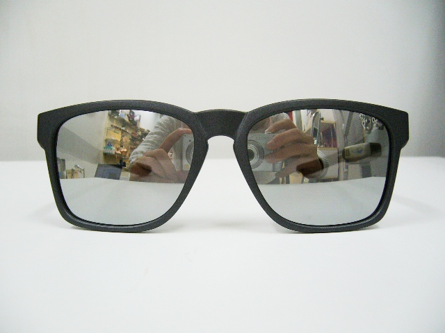こちらは既存カラーのモデルです。レンズカラーが特徴で、ご覧いただくとお分かりのように、写真を取っている姿がバッチリと映ってしまうほどの濃いミラーレンズ。