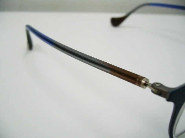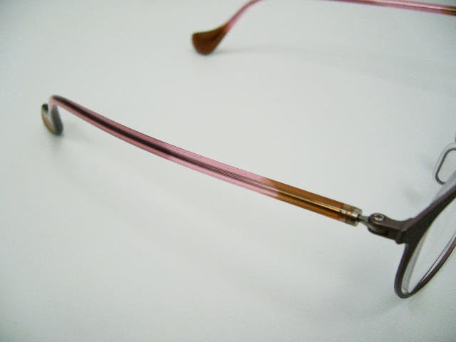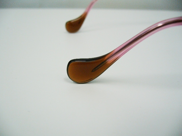 テンプルは樹脂製素材でクリアなブラウンとピンクのグラデーション。円柱状になっているので耳への当たりも柔らかく感じると思います。