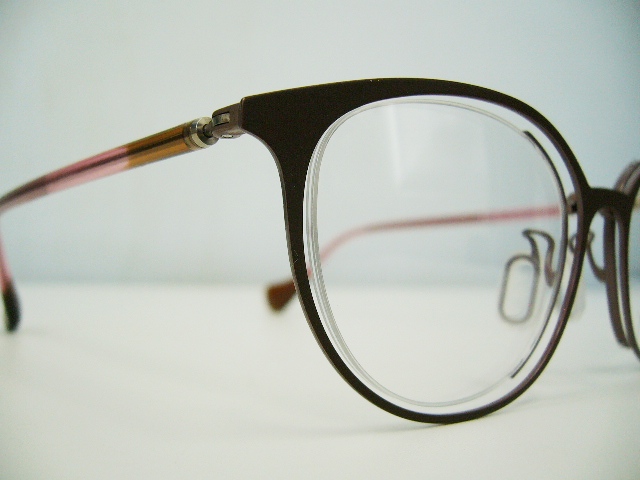 Col.03 フロントはメタル素材でカラーはマットブラウン。レンズシェイプは少し大き目でボストンとウェリントンを足したような形。全体的に優しい印象です。