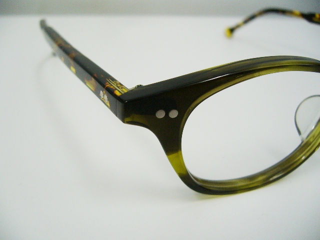 Col.521/504 フロントは透明感のあるオリーブグリーン。マーブル模様とはまた違った独特の濃淡のある柄。クリアだけど深みのあるグリーンなので日本人の肌に合うカラーとなっています。