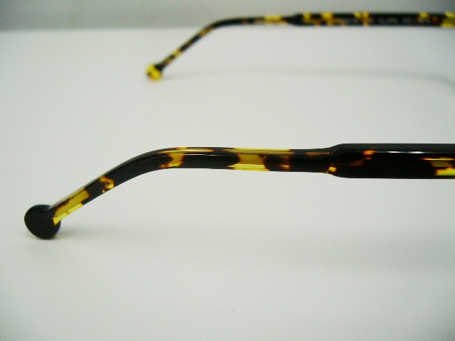 テンプルカラーは黄色みの強いブラウンデミ。形がちょっと個性的。途中に段差がありアクセントになっています。またモダン先端が丸くなっていてちょっとコミカルな雰囲気♫正面のテンプルの印象とは真逆な感じがまた面白いですね。