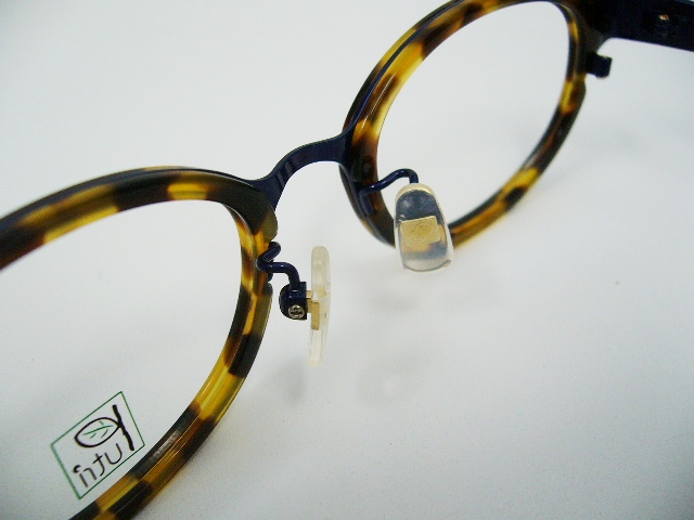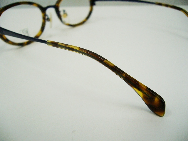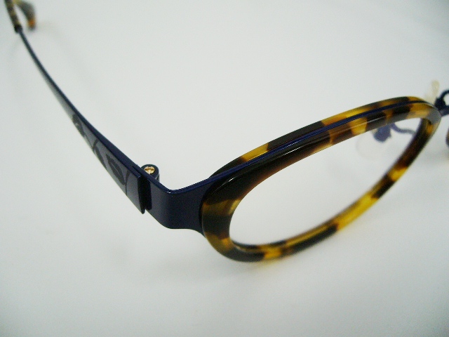 このモデルはブルーのメタル素材をデミ柄の樹脂素材で挟んだコンビネーション。