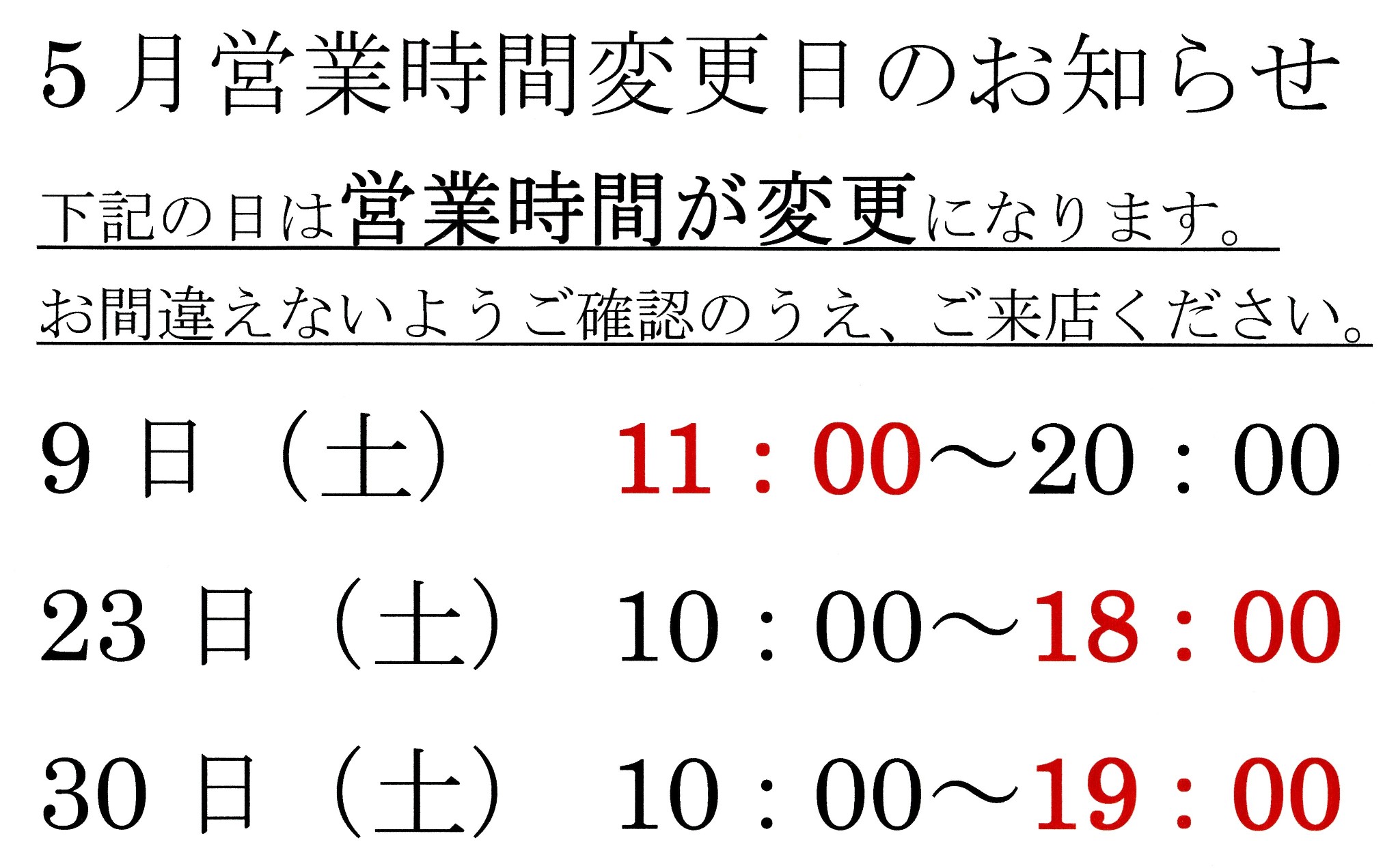 5月は営業時間変更日があります お知らせ 投稿日| 2009.05.07 最終更新日| 2013.09.09 土曜日ばかりですが、用事が重なりまして・・・・ ご確認のうえ、お間違いないようご来店ください。 休日の変更はございません。
