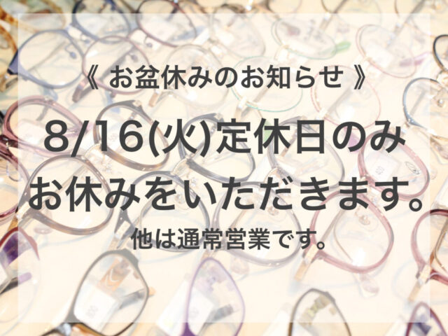 お盆休みの営業について。 お知らせ 投稿日| 2022.08.10 最終更新日| 火曜日の定休日以外は朝10時より夜7時まで通常営業しております。 メガネの調整・クリーニングも承りますので気軽にお立ち寄りください。 皆様のご来店お待ちしております。